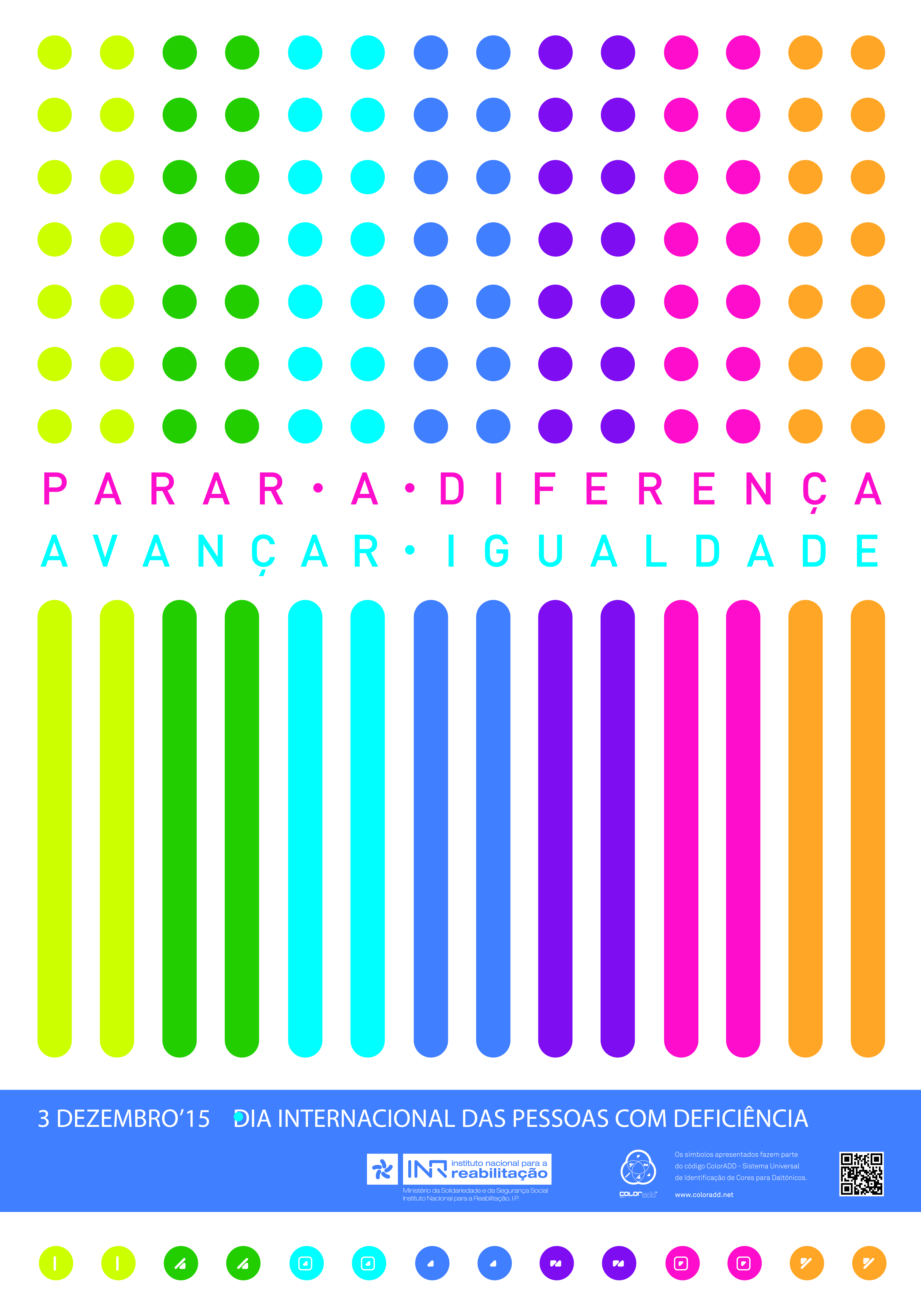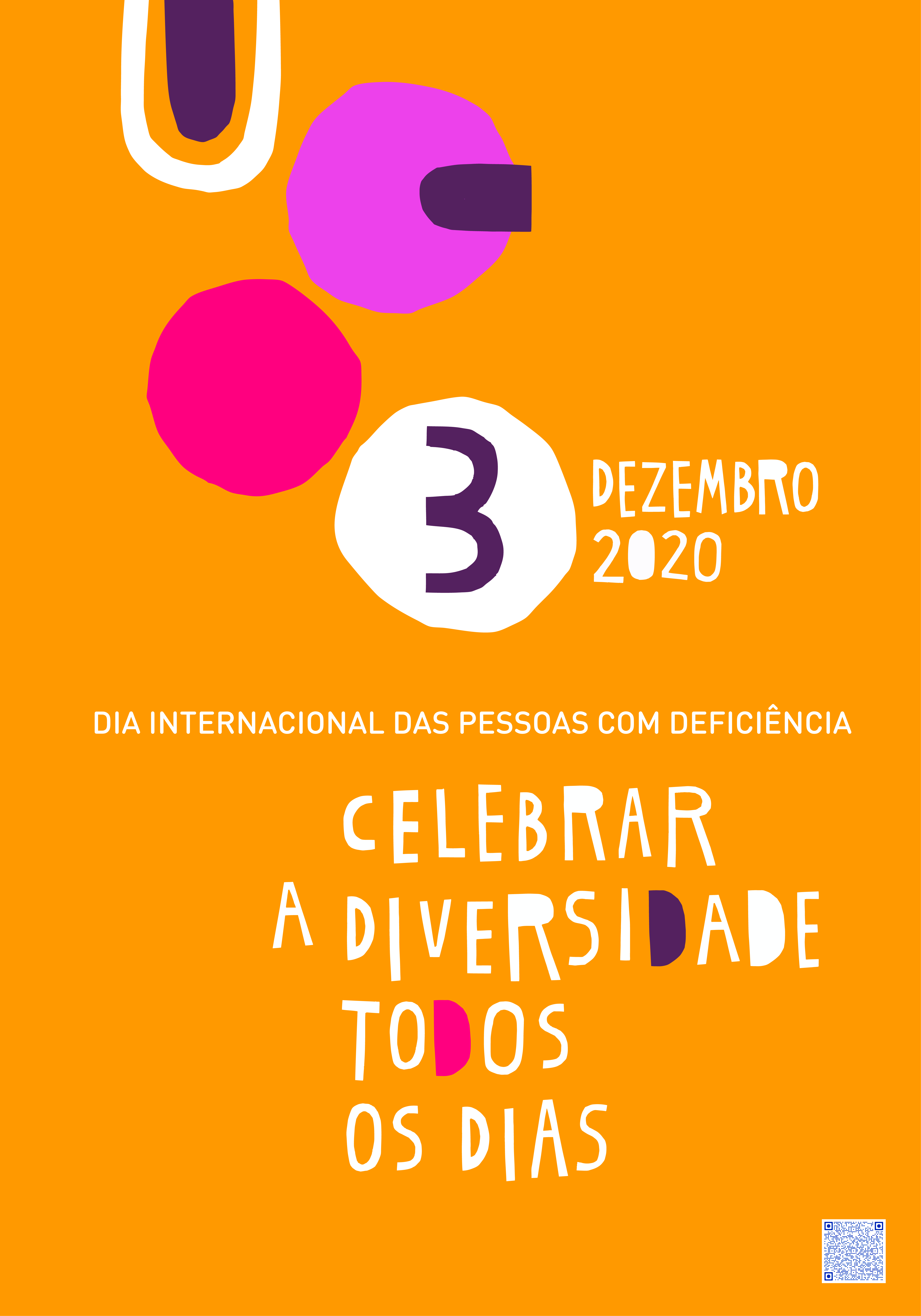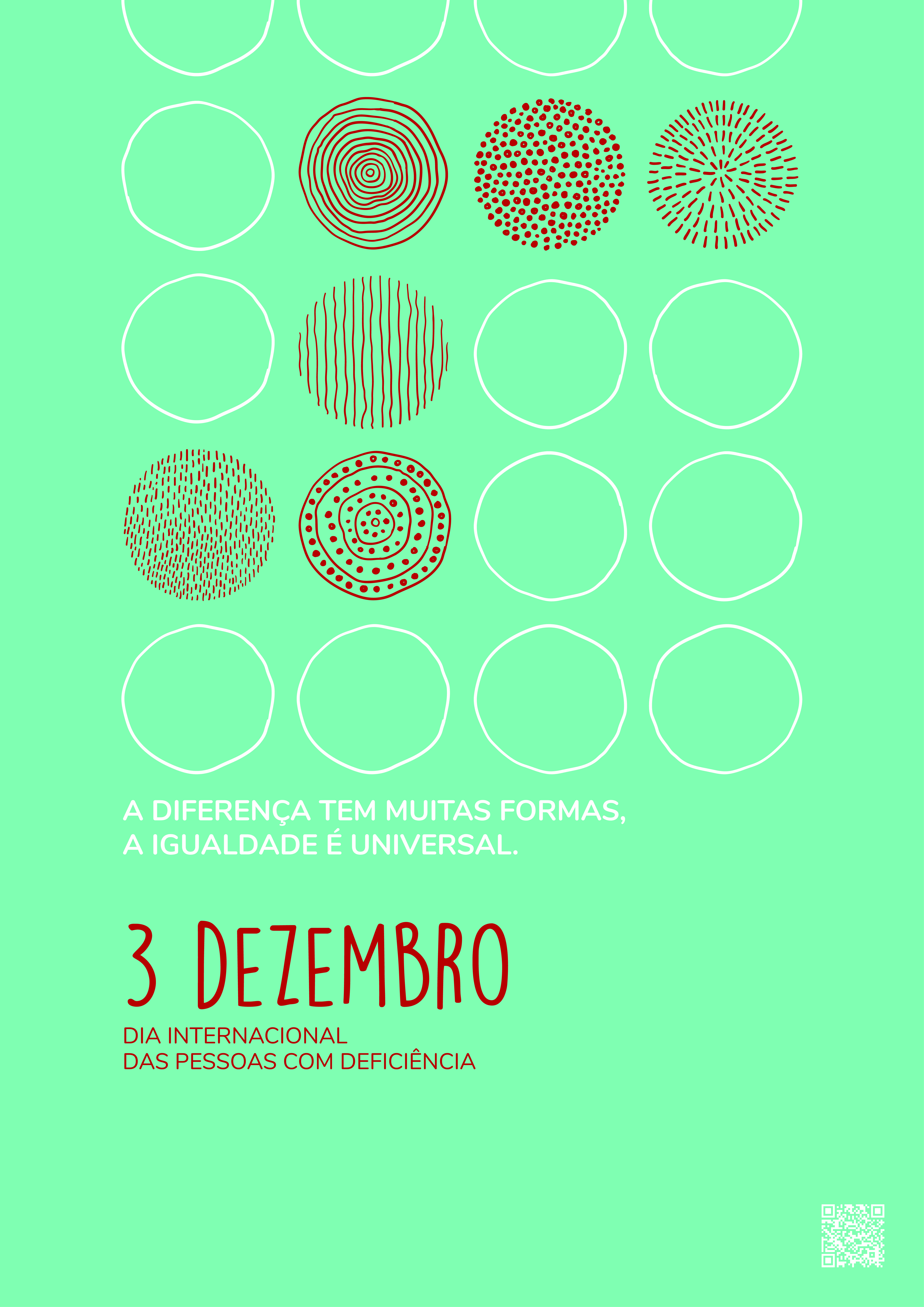 Text: on the last third of the poster, below the circles, from left to right, in white: “Difference takes many forms, equality is universal”. Below, in a different color, much larger and in a more irregular and less rigid font: “3 December”, below and smaller “International Day of Persons with Disabilities”. In the lower right corner: QrCode with link to audio description of the poster.