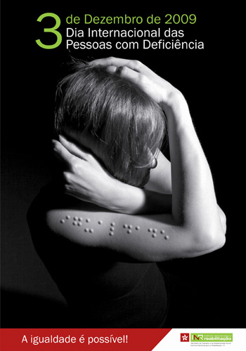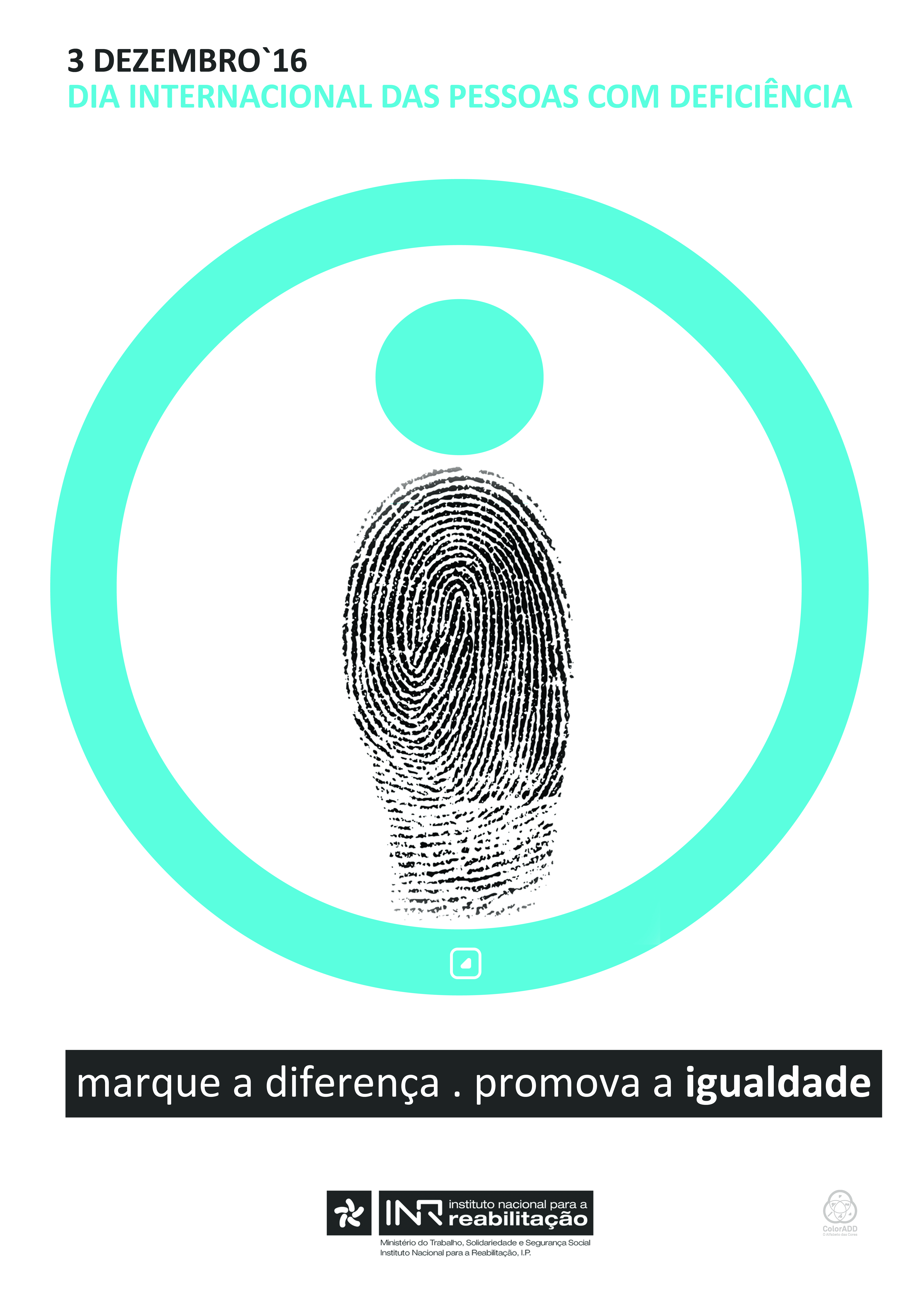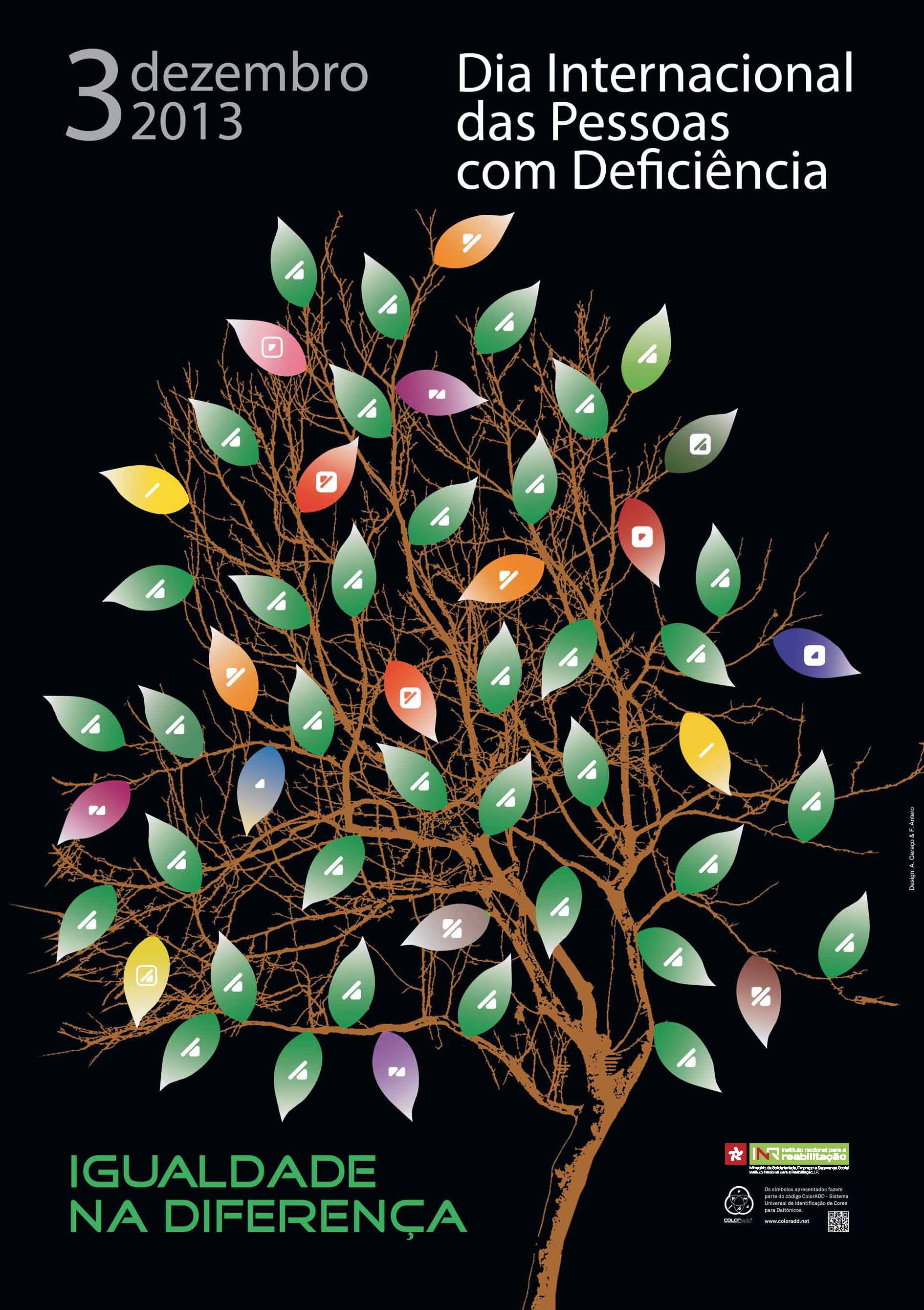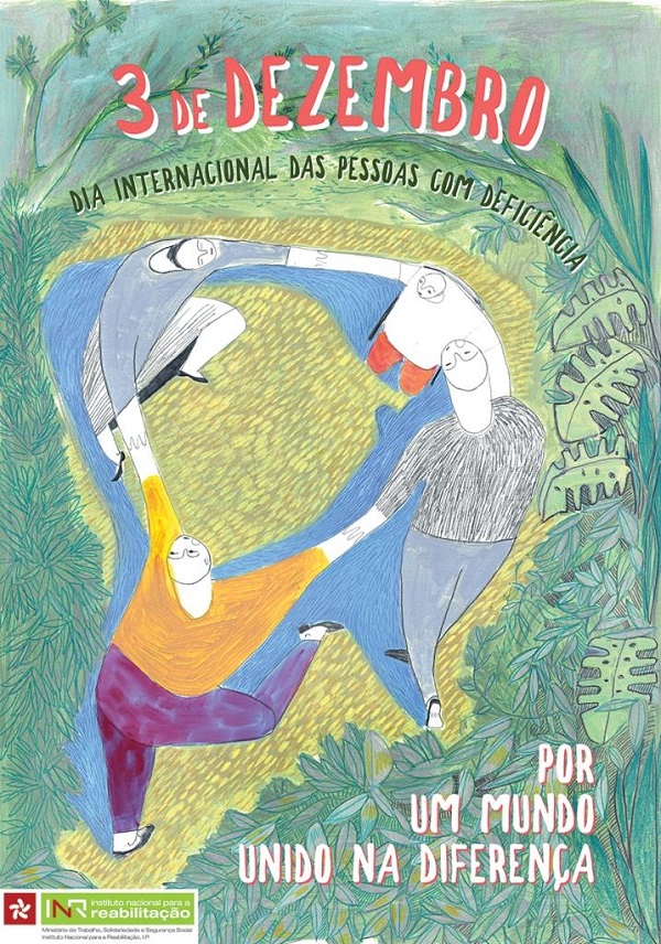 Description of the image, according to the winners: For the background, we chose an orange – combined with white, warm yellow and garnet – a range of colours that visually accentuates the positive character of the message. We opted for a composition made by letters and shapes, avoiding the use of stereotyped images so commonly used, which expose and stigmatize people with functional diversity. All the elements were, therefore, cut by hand and without a previous drawing, assuming the uniqueness and beauty of their imperfections, symbolizing the identity of each one. The 3, on a larger scale, marks the day and makes more evident the irregularities of the contour, assuming the humanizing dimension that is intended to give the poster.