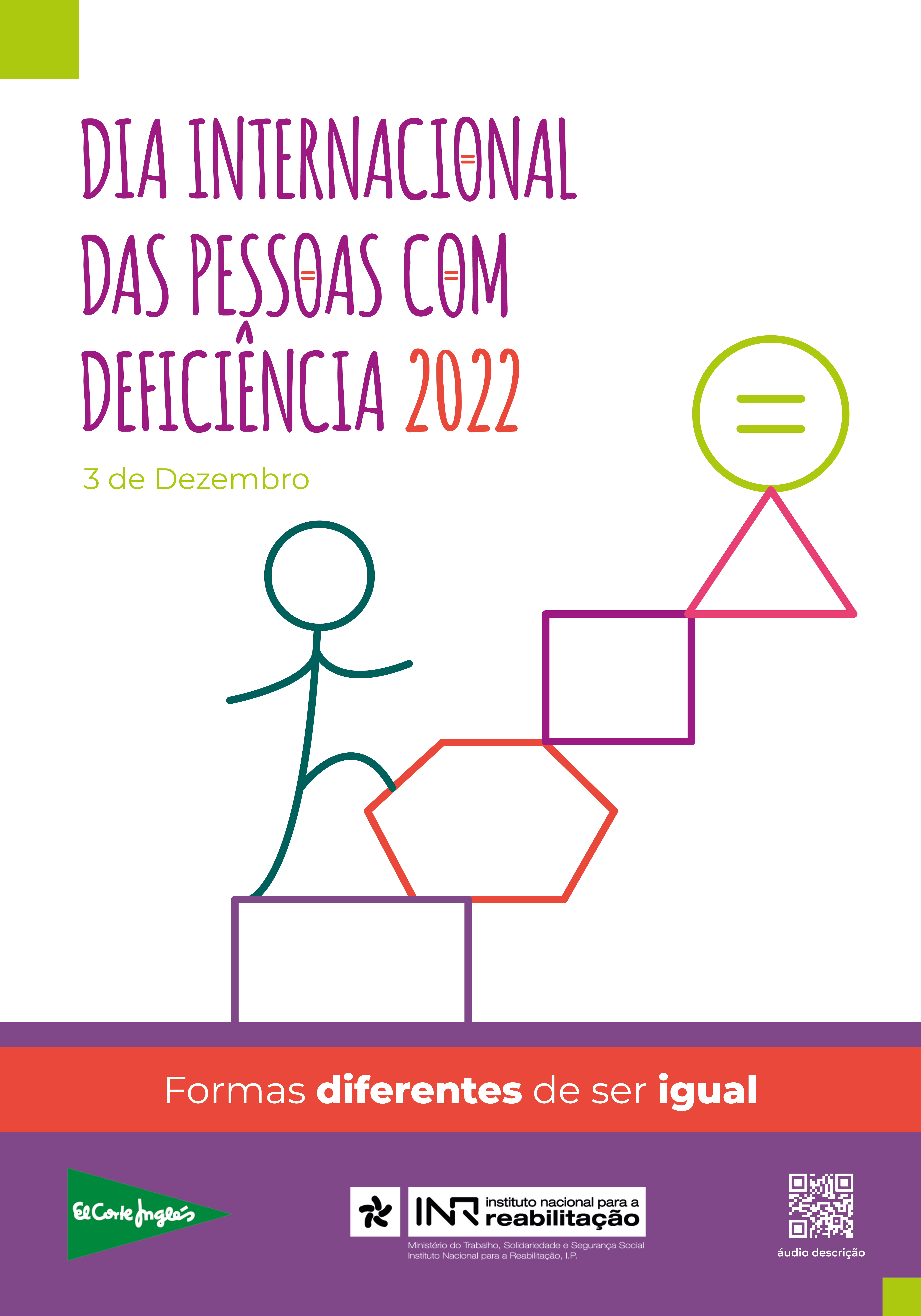 White background, combined with purple in the last third of the poster highlighting the message Different shapes to be equal and two green squares, one in the upper left corner and one in the lower right corner.