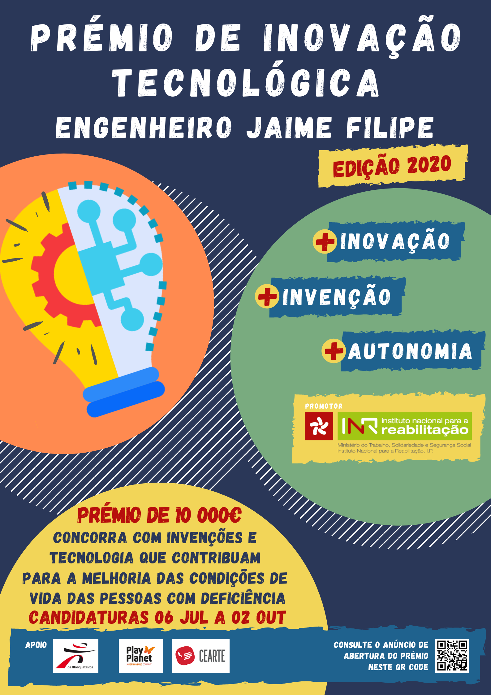Poster Award for Technological Innovation by Jaime Filipe 1587x2245px [ PNG | JPEG | PDF ] Image Description: pdark blue background, composed of three balls, one orange leaning against the poster's right margin, another green leaning against the left margin and another yellow, at the bottom, slightly cut at its lower limit. At the top of the poster, centered and in white, reads Technology Innovation Award Engineer Jaime Filipe. Just below, on a small yellow label, positioned on the right side, appears edition 2020, written in red. Inside the orange ball is a lamp, divided in half, with two images: half of a sprocket and, in the other image, a part of a microprocessor. Inside the green ball there are three blue labels with the concepts + innovation, + invention, + autonomy and, underneath, centered, the logo of the INR, promoter of the prize, on a yellow label. Inside the yellow ball reads Prize of 10 000€, compete with inventions and technology that contribute to the improvement of the living conditions of people with disabilities. Applications from 06 Jul to 02 Oct. On a blue label that crosses the poster, in the footer, are the logos of the Musketeers Groupfrom Play Planet and CEARTE, which support this award, the image of the QR CODE and the mention See the announcement of the opening of the Prize in this QR Code, positioned in the lower right corner.