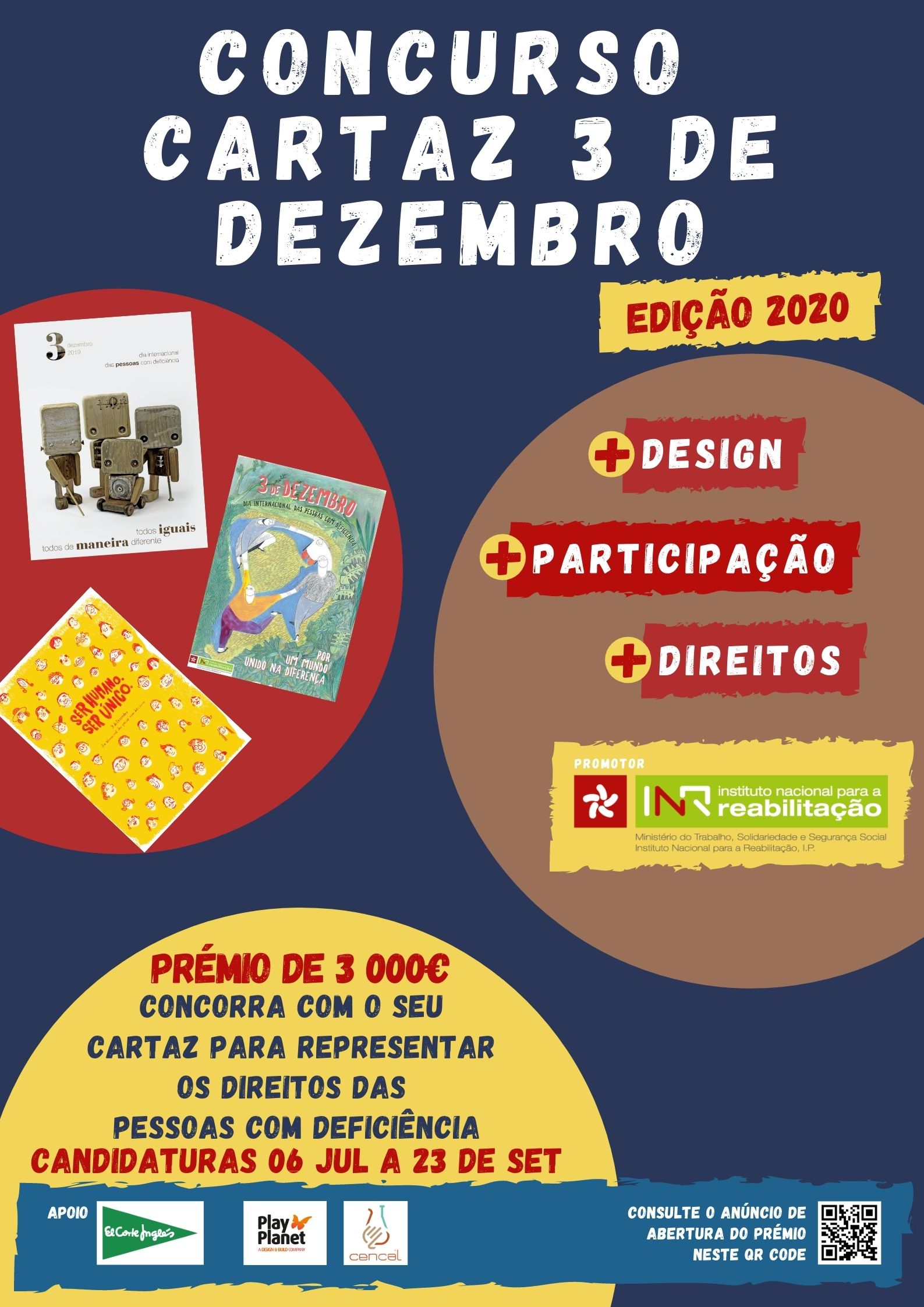 Poster Prize Poster December 3rd 1587x2245px[ PNG | JPEG | PDF ] Image Description: dark blue background poster, composed of three balls, one red against the right bank of the poster, another brown against the left bank and another yellow, at the bottom, slightly cut at its lower limit. At the top of the poster, centered and in white, reads Poster Contest December 3. Just below, on a small yellow label, positioned on the right side, appears edition 2020, written in red. Inside the red ball are three images of the winning posters from the last three editions of this award. Inside the brown ball there are three red labels with the concepts + design, + participation, + rights. Underneath, centred, the logo of the INR, promoter of the prize, on a yellow label. Inside the yellow ball reads Prize of 3 000€, compete with your poster to represent the rights of people with disabilities, applications from 06 Jul to 23 Sep. On a blue label that crosses the poster, in the footer, are the logos of El Corte Inglés, Play Planet and CENCAL, which support this award, the image of the QR CODE and the mention See the announcement of the opening of the Prize in this QR Code, positioned in the lower right corner.