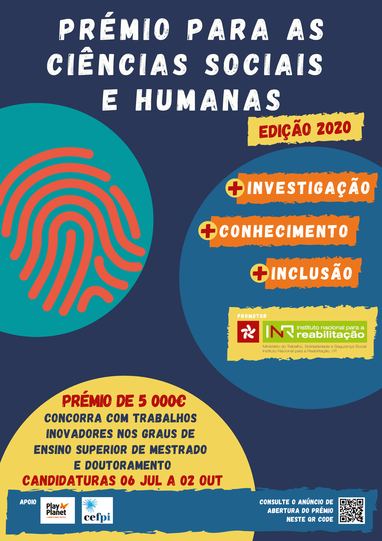 Poster Prize for Social Sciences and Humanities 1587x2245px [ PNG | JPEG | PDF ] Image Description: dark blue background poster, composed of three balls, one marine green leaning against the right margin of the poster, another blue leaning against the left margin and another yellow, at the bottom, slightly cut at its lower limit. At the top of the poster, centered and in white, reads Prize for the Social Sciences and Humanities. Just below, on a small yellow label, positioned on the right side, appears edition 2020, written in red. Inside the sea green ball is a drawing of an orange fingerprint. Inside the blue ball there are three orange labels with the concepts + research, + knowledge, + inclusion, underneath, centered, the logo of the INR, promoter of the prize, on a yellow label. Inside the yellow ball reads Prize of 5 000€, compete with innovative works of the degrees of higher education of master and doctorate, Applications from 06 Jul to 02 Oct. On a blue label that crosses the poster, in the footer, is the logo of Play Planet and CEFPI, which support this prize, the image of the QR CODE and the mention See the opening announcement of the Prize in this QR Code, positioned in the lower right corner.